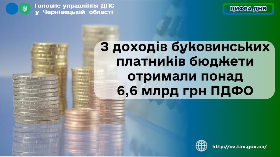 У січні–жовтні 2025 року платники податків Чернівецької області сплатили до бюджетів усіх рівнів 6 мільярдів 636 мільйонів гривень податку на доходи фізичних осіб (ПДФО). Це на 1 мільярд 141,1 мільйона гривень більше, ніж за аналогічний період минулого року.