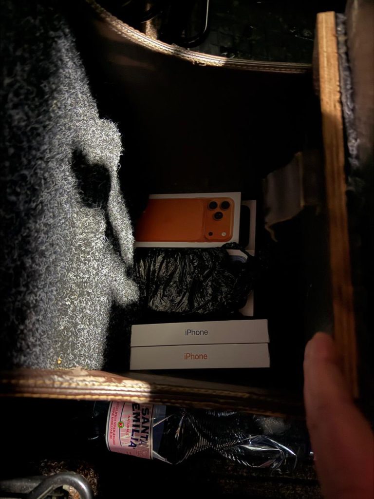Порушення викрили охоронці рубежу в пункті пропуску «Шегині». Десять телефонів марки iPhone прикордонники виявили в спеціально облаштованому сховку в підлокітнику мікроавтобуса.
