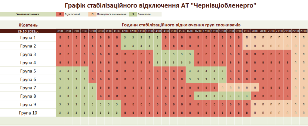 Переглянути графік відключень можна переглянути на сайті «Чернівціобленерго» за цим посиланням, з’ясувавши до якої групи споживачів належить ваша адреса.