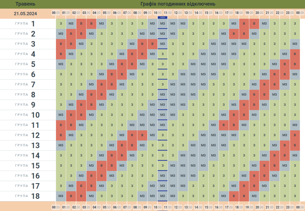 У вівторок, 21 травня, з 00:00 та впродовж доби по всій території Україні діятимуть графіки погодинних відключень електроенергії. На Буковині світло вимикатимуть почергово 18 групам.