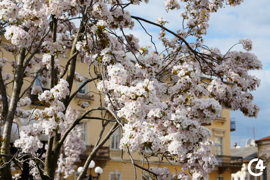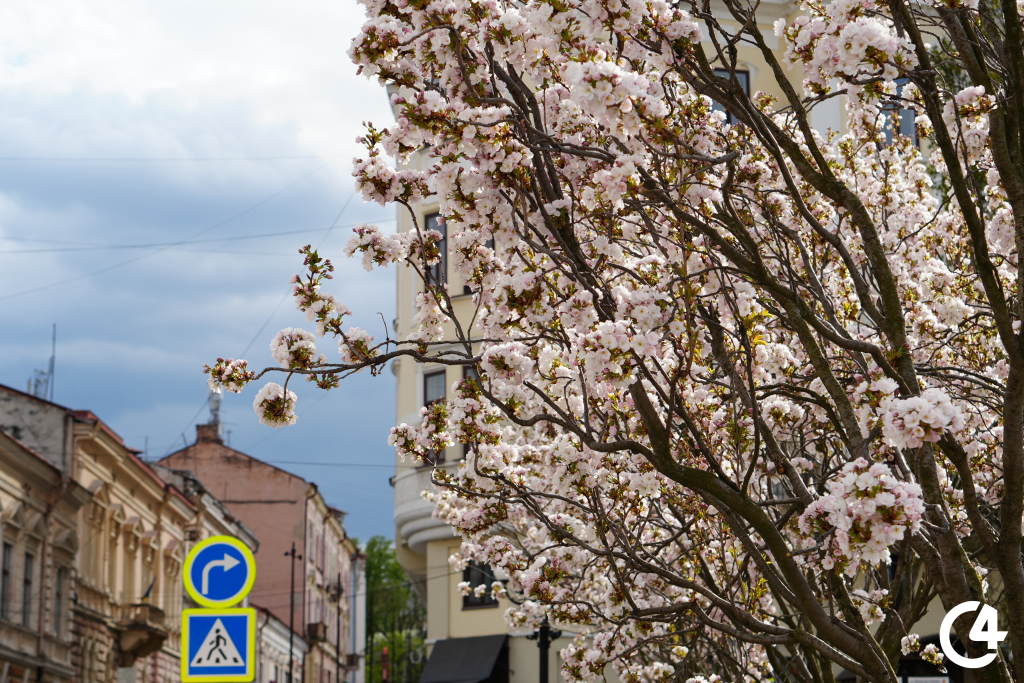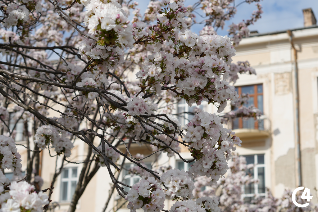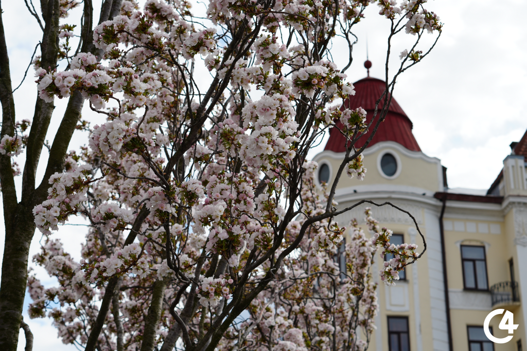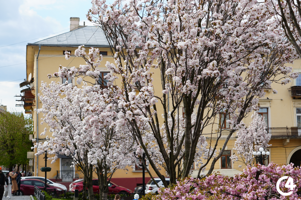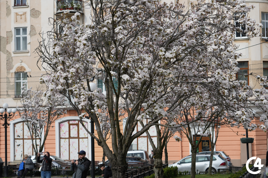 У Чернівцях зацвіли сакури. Їхнє цвітіння, зокрема, можна спостерігати на площі Філармонії.