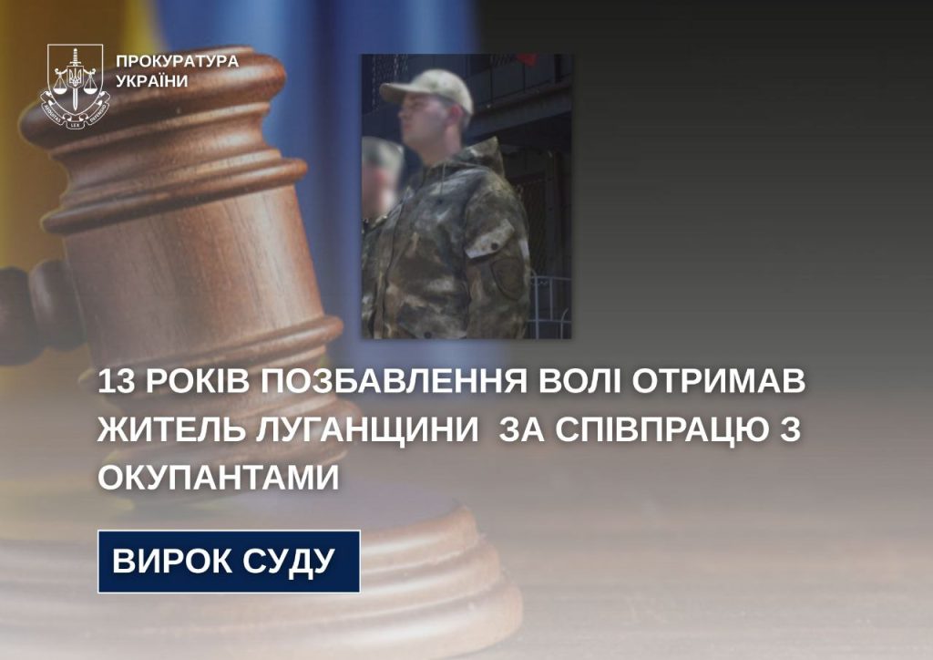 Шевченківський районний суд Чернівців заочно засудив 23-річного жителя Луганщини до 13 років позбавлення волі з конфіскацією майна за співпрацю з окупантами. Також йому заборонено обіймати державні та публічні посади протягом 15 років.