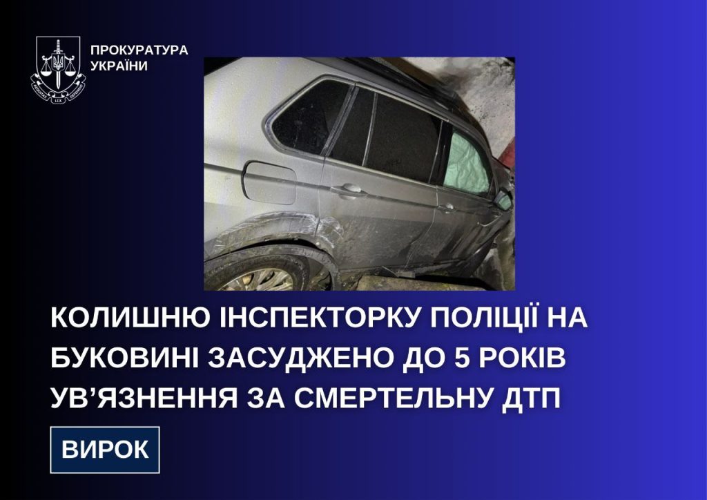 До п’яти років ув’язнення за смертельну ДТП засудили колишню інспекторку поліції на Буковині. Аварія, у якій загинула 35-річна жінка, сталася в липні 2025 року в місті Новоселиця.