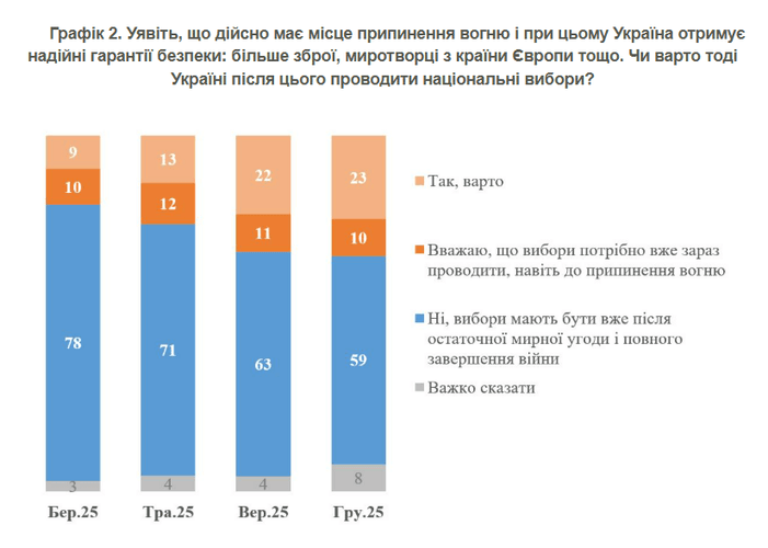 Водночас 59% опитаних переконані, що вибори можливі лише після укладення остаточної мирної угоди й повного завершення війни. У вересні такої думки дотримувалися 63% респондентів.