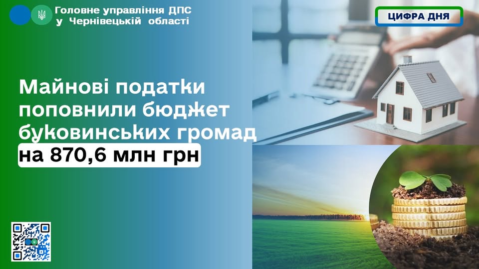 Упродовж десяти місяців 2025 року юридичні та фізичні особи Чернівецької області сплатили до місцевих бюджетів 870,6 млн грн майнових податків. Це на 141,6 млн грн більше, ніж за аналогічний період минулого року.