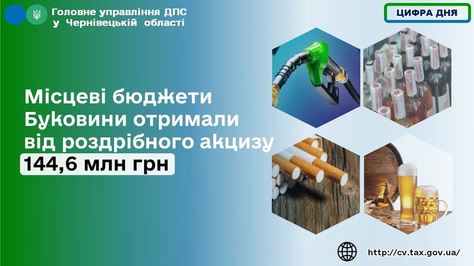 Місцеві бюджети Буковини отримали понад 144 млн грн від роздрібного акцизу