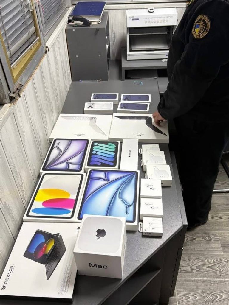 Під час огляду багажу виявили техніку світового бренду Apple: смартфони iPhone 17 Pro та 17 Pro Max, планшети iPad, навушники AirPods, смарт-годинник Apple Watch, системний блок Apple Mac mini, клавіатури Apple та Dexnor, а також зарядні пристрої Apple.