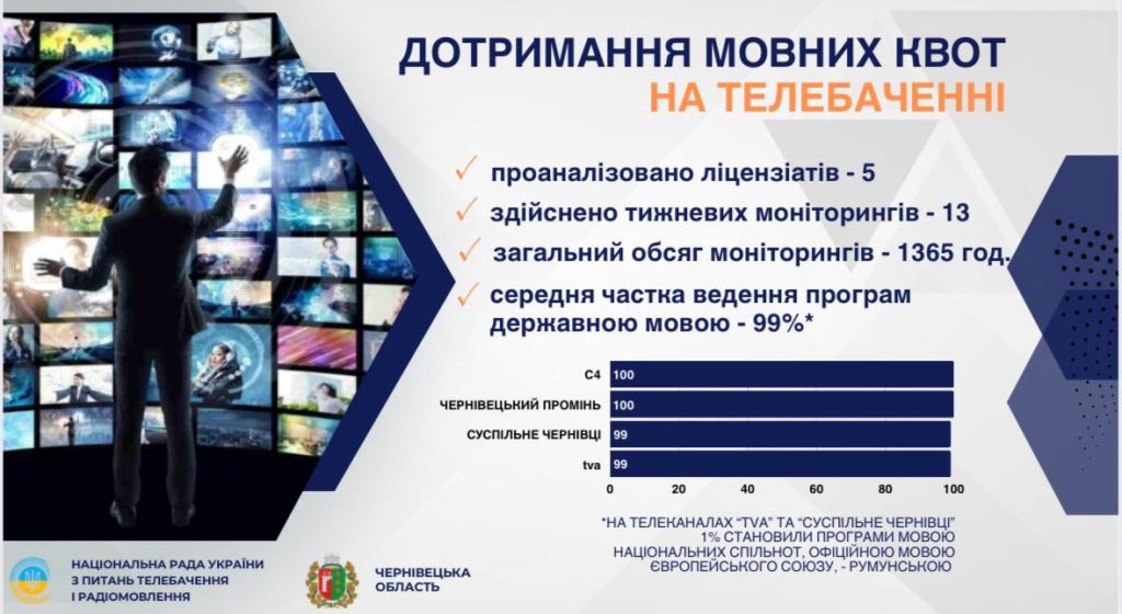 Зокрема, телеканали «С4» та «Чернівецький промінь» забезпечили стовідсоткове мовлення державною мовою. На «Суспільному Чернівці» та «ТВА» 1% етеру припав на програми мовами національних спільнот, зокрема румунською.