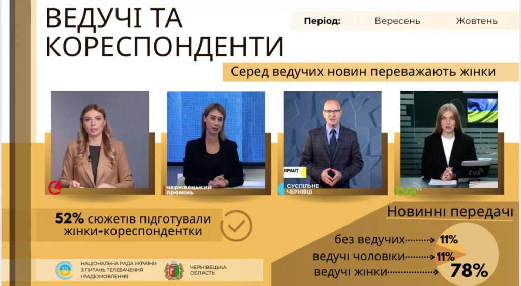 Під час моніторингу окремо аналізували гендерний баланс. За даними Нацради, серед ведучих новин на Буковині домінують жінки — 78%.