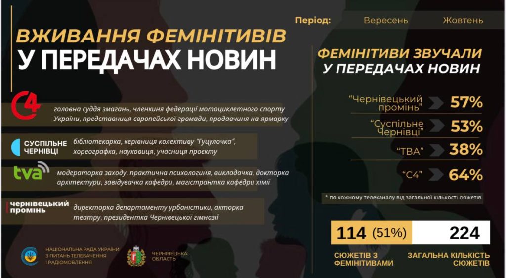 Ще однією тенденцією стало активне використання фемінітивів. Найвищий показник їх уживання зафіксували на телеканалі «С4» — 64%. У медіа дедалі частіше звучать назви посад і професій у жіночому роді, зокрема «директорка», «науковиця», «членкиня».