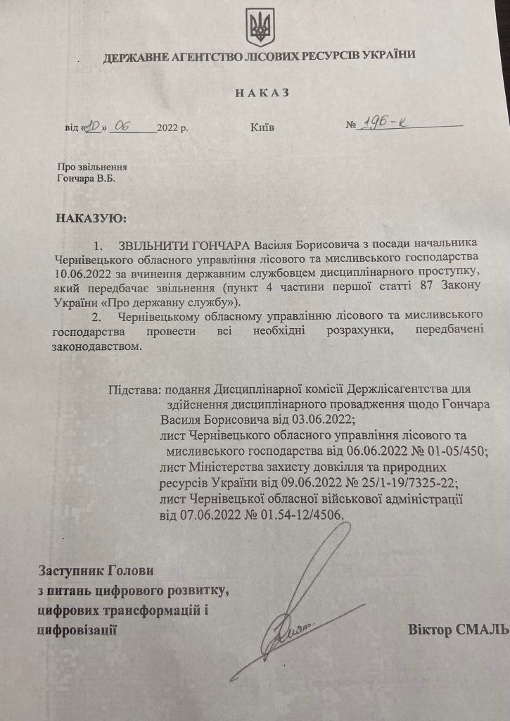 Нагадаємо, Василя Гончара 10 червня звільнили з посади начальника Чернівецького обласного управління лісового та мисливського господарства. Відповідний наказ №196-К підписав заступник Голови з питань цифрового розвитку, цифрових трансформацій та цифровізації Віктор Смаль.
