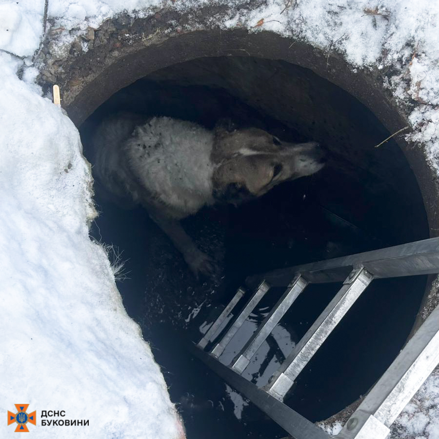 У місті Заставна 9 січня собака впав у яму через проломлений каналізаційний люк. Чотирилапому, який скавчав і не міг самостійно вибратися, на допомогу прийшли рятувальники.