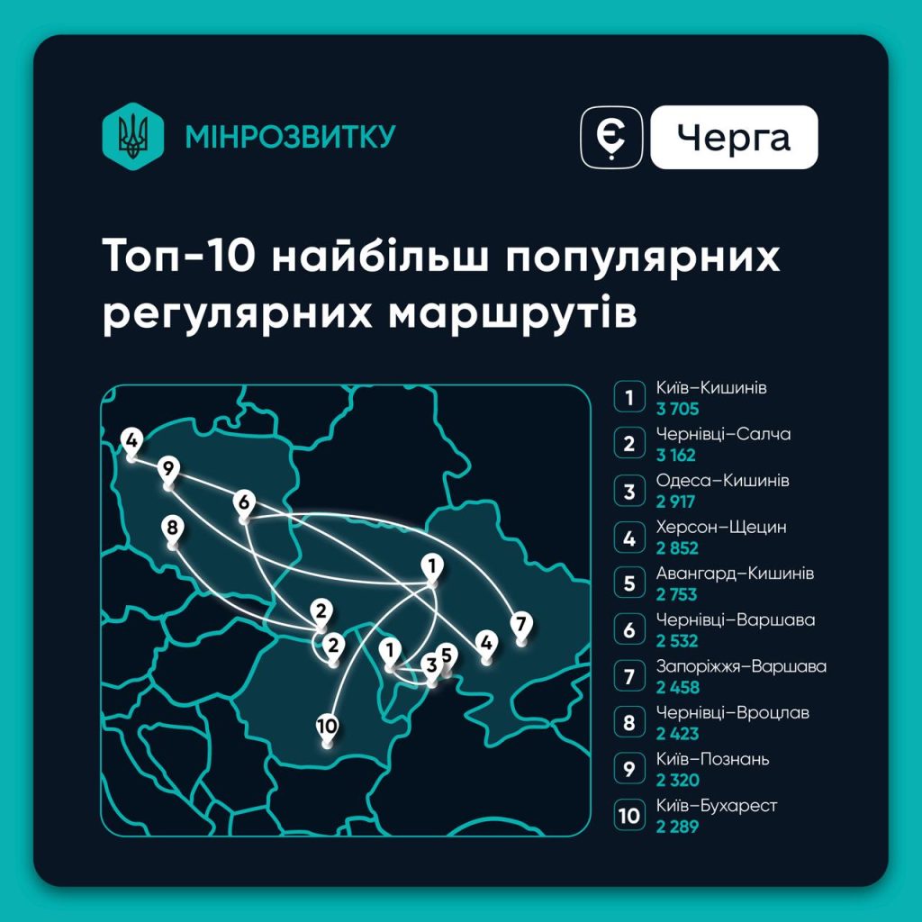 З інфографіки також стало відомо, що до десятки найпопулярніших регулярних маршрутів увійшли «Чернівці — Салча», «Чернівці — Варшава» та «Чернівці — Вроцлав».