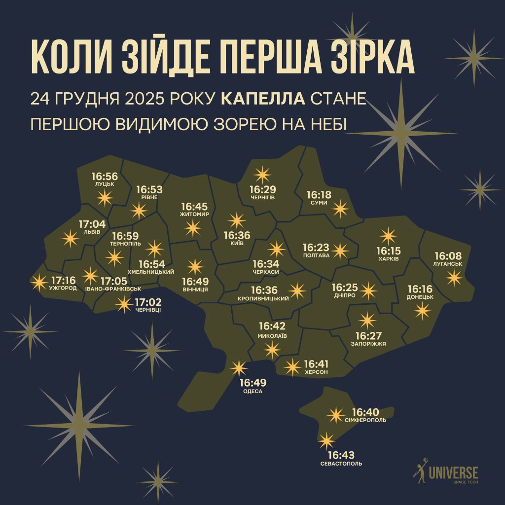 На Святвечір першим зореподібним об’єктом, який можна буде побачити неозброєним оком незадовго після заходу Сонця, стане Капелла.