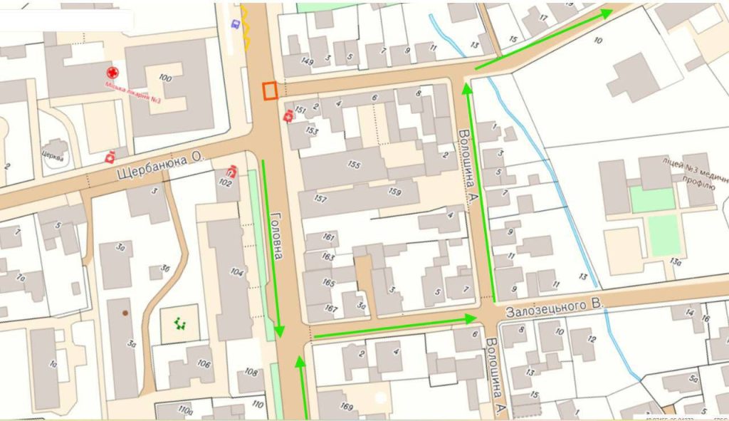 На час виконання робіт водіям рекомендують користуватися об’їздом за маршрутом: Залозецького — Волошина — Руданського. Дивіться схему об’їзду на фото: