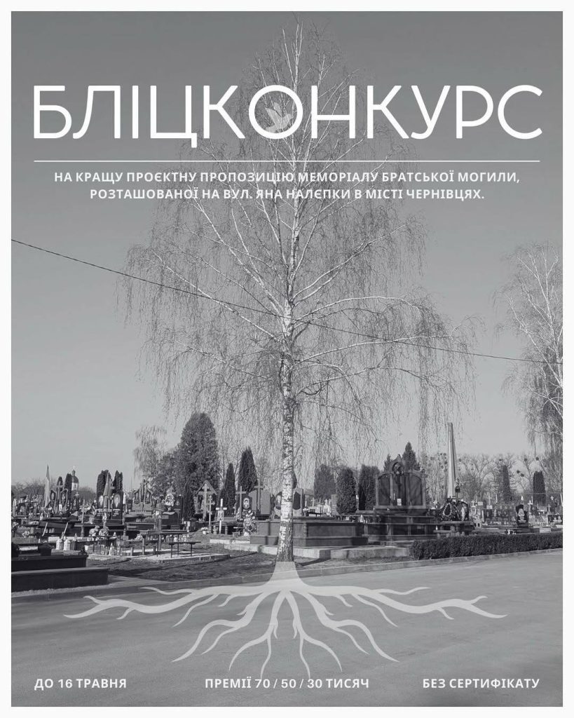 Департамент урбаністики та архітектури Чернівецької міської ради оголошує проведення Всеукраїнського архітектурного бліцконкурсу на створення меморіалу братської могили загиблих Захисників в системі центрального входу на кладовище, розташованого на вулиці Яна Налепки. На реєстрацію учасників та проєктування відведено 1,5  місяці, а саме з 16 березня до 1 травня 2026 року.