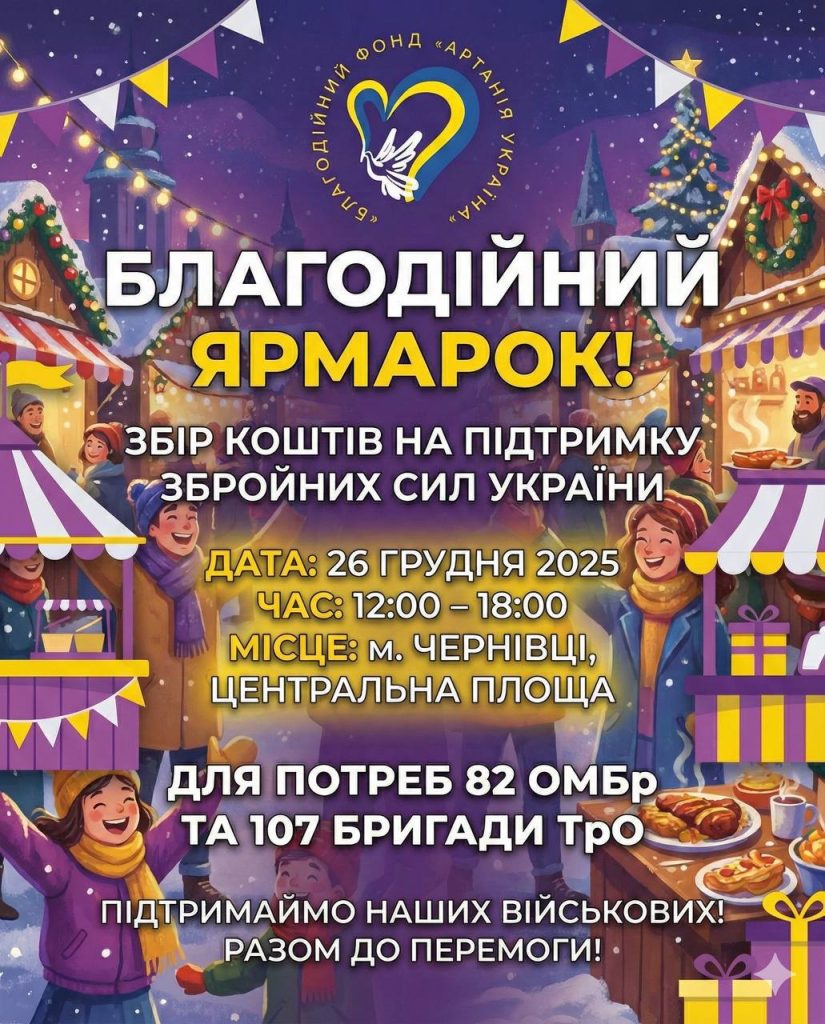 Різдвяний благодійний ярмарок Artania Fest відбудеться в Чернівцях 26 грудня. Під час події збиратимуть кошти на підтримку українських захисників.