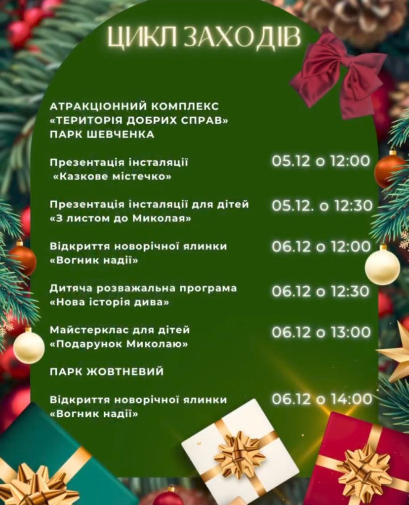 Протягом 5–6 грудня на дітей та їхніх батьків чекатиме насичена програма до Дня святого Миколая. Святкові заходи відбудуться у парку Шевченка та парку Жовтневому.