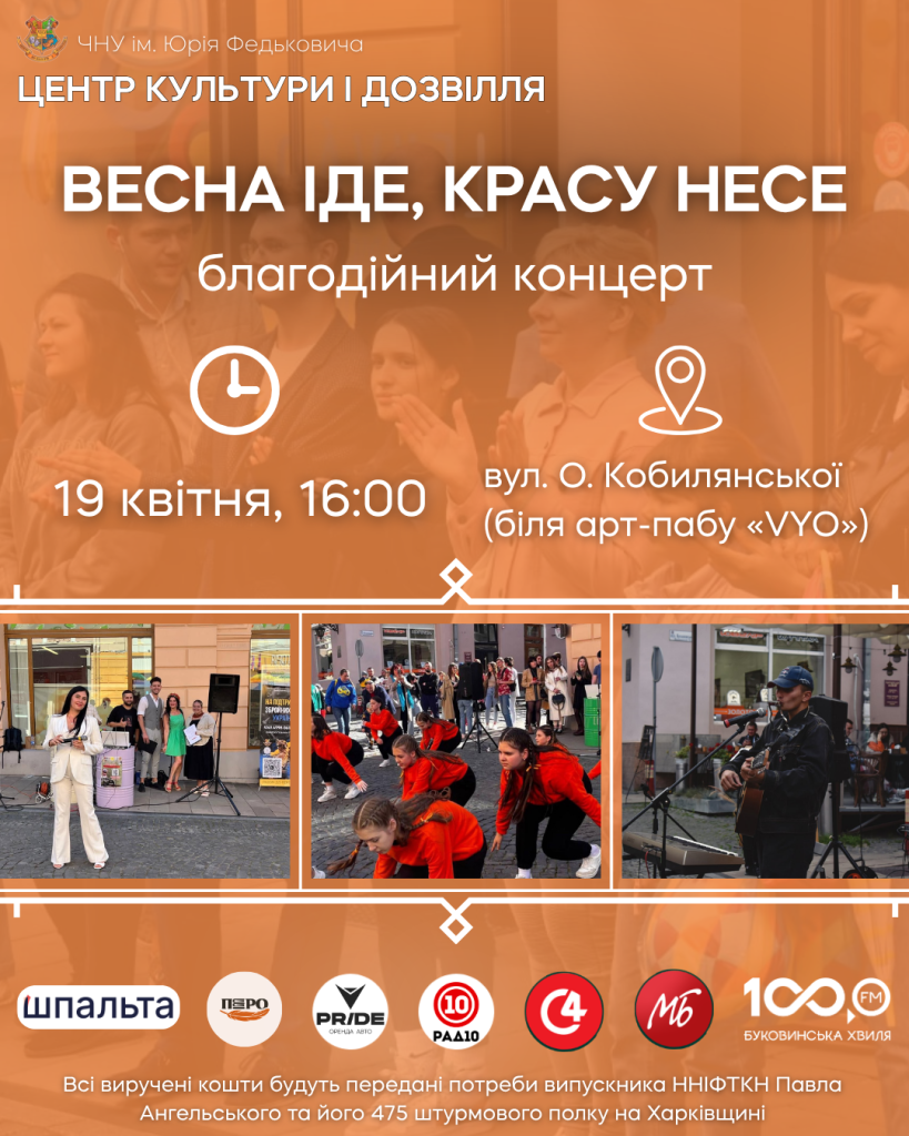 У неділю, 19 квітня, у Чернівцях пройде благодійний концерт «Весна іде, красу несе» від Центру культури й дозвілля ЧНУ та інших артистів Буковини.