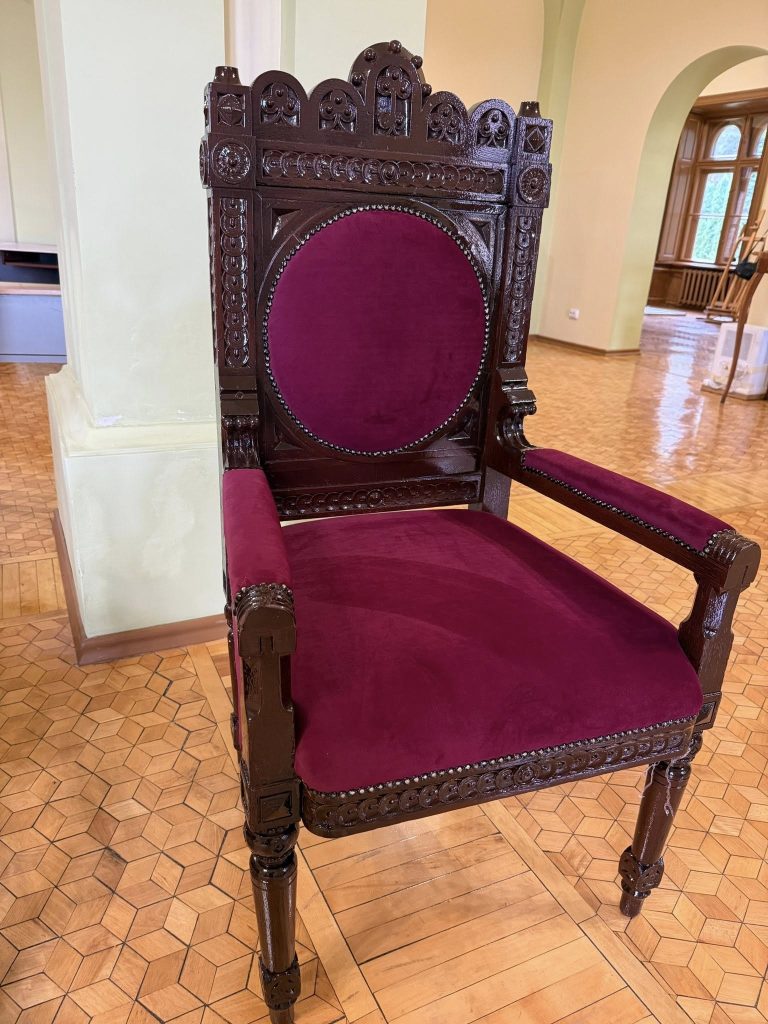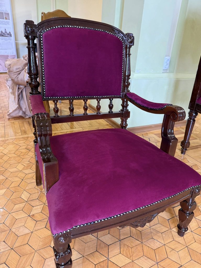 Перше крісло різьблене з гарнітуру особистої приймальні митрополита, виконане з твердих порід дерева з декоративною різьбою, м’якими підлокітниками та оксамитовою оббивкою.