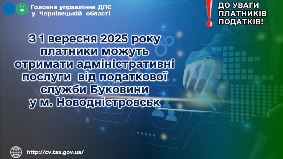 Головне управління ДПС у Чернівецькій області інформує жителів м. Новодністровськ: платники податків мають можливість отримати адміністративні послуги за адресою: м-н Юність, 1Г.